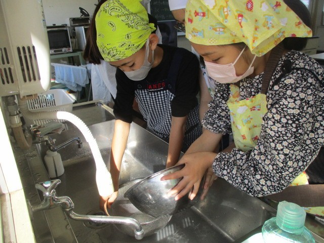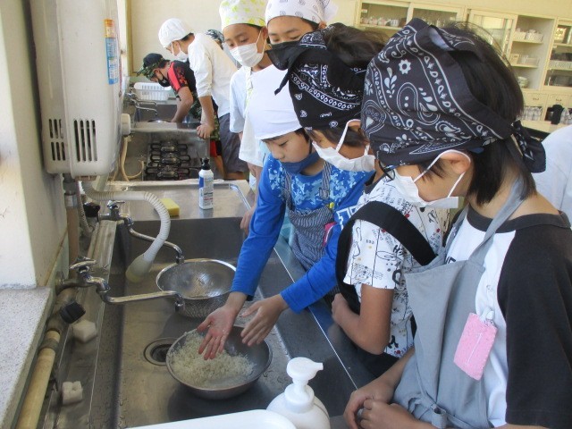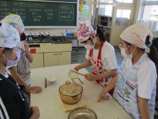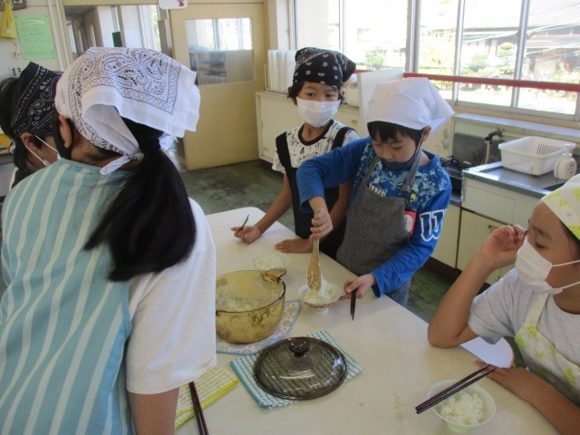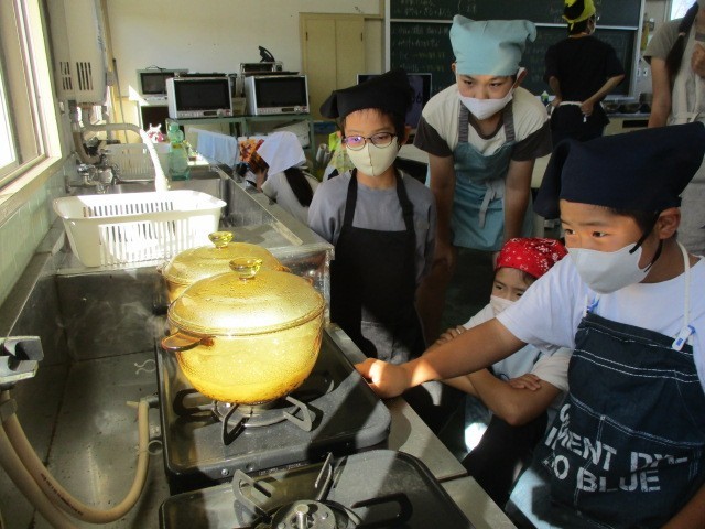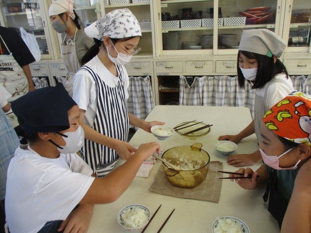 家庭 1時間目と2時間目に1組が調理実習を行いました。耐熱ガラス鍋を使って、お米がご飯に変化する様子を観察しました。最後は美味しく食べました。