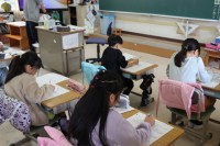 書写作品コンクールに取り組みます。「小川」、始筆、止め、はね、払い、一画一画真剣に書いていました。