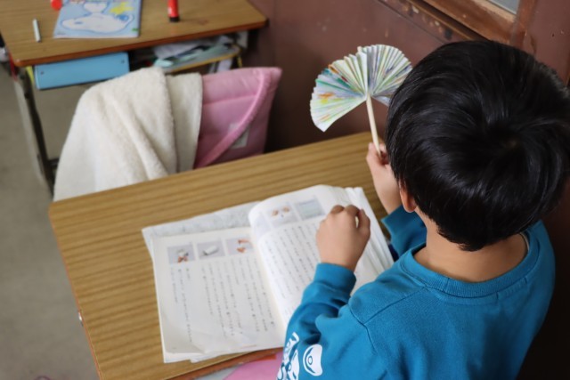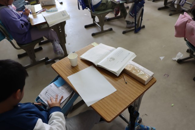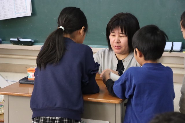 説明文にある手順通りに紙コップから飛び出す花火を作成しています。作成したら先生にチェックをしてもらっていました。