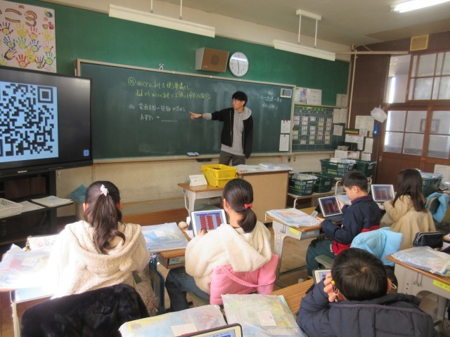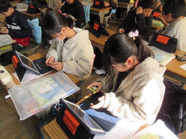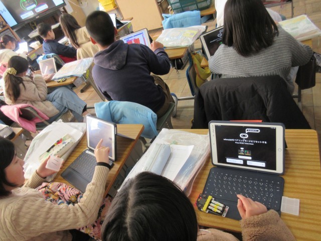 総合的な学習「マイクロビットではじめるプログラミング」タブレットにプログラミングソフトを立ち上げてマイクロビットに接続しました。