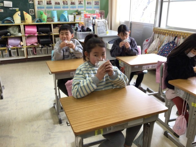 「なんだろう?このかおり?」「パンの香りがするよ」など楽しそうな声や「とちもちは、まさに伝説の味!」と6年生を送る会の台詞に乗せてその感動を伝える子も。
