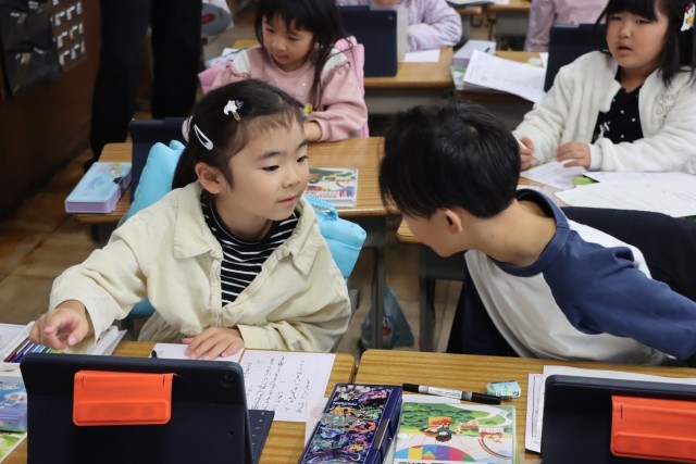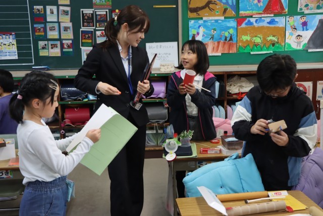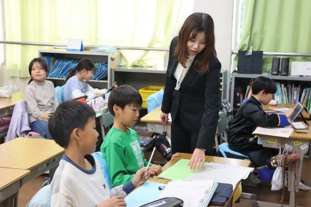 学校 上:4年生の音楽科では、「とんび」を学習しています。歌詞にある「ピンヨロー」のより良い歌い方をグループで話し合っていました。 中:5年生の算数科では、物さしを使って歩幅を測っていました。数回記録することから平均を知ります。 下:4年生の国語科では、説明文を使って文章の構造を学習します。今日は、「未来につなぐ工芸品」の教材を形式段落に分けるところからスタートです。