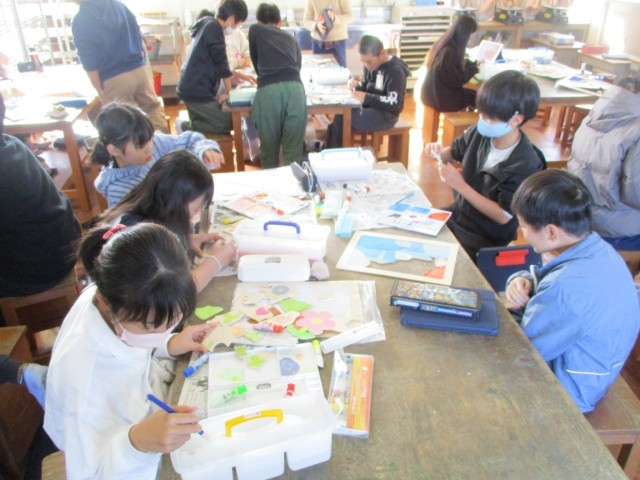 中:今日は、5年生が糸のこぎりを使って学習していました。薄い板からパズルを切り出していました。それぞれの児童が思い思いの絵柄を工夫していました。