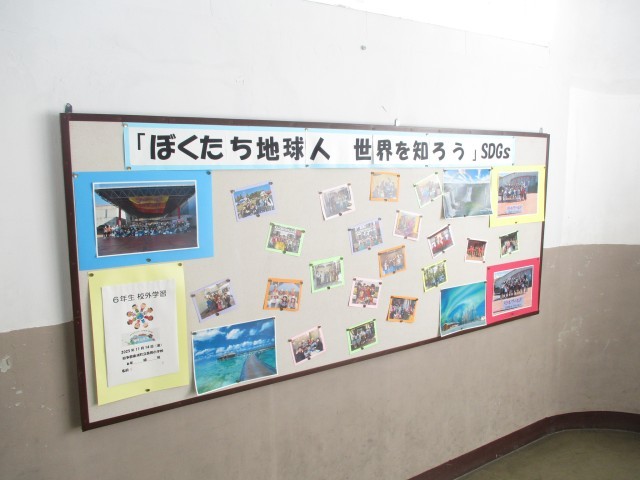 下:6年生、総合的な学習の時間では、「ぼくたち地球人、世界を知ろう」というテーマで学習しています。先日訪れたリトルワールドでの見学内容が校内に掲示されました。
