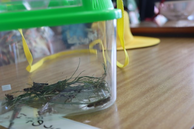 午前中の虫取りの結果をみんなで話していました。虫かごにはたくさんの虫が入っていました。