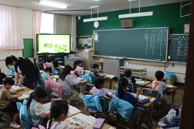 カタカナをきれいに書く練習をしています。復習を兼ねて教師が読む「もの」をカタカナで書いてある絵の中から素早く探すゲームをしていました。