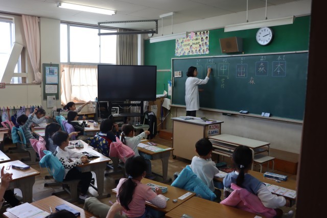 カタカナをきれいに書く練習をしています。復習を兼ねて教師が読む「もの」をカタカナで書いてある絵の中から素早く探すゲームをしていました。