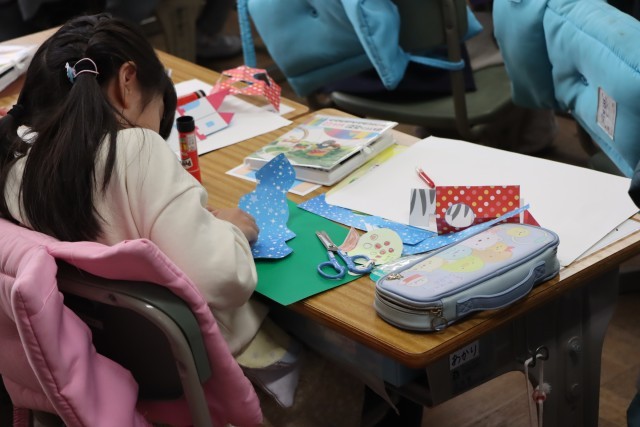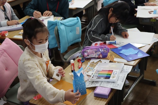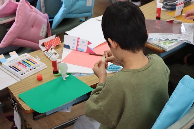 「おってたてたら」の単元の学習をしています。おり方や切り方を工夫して制作しています。