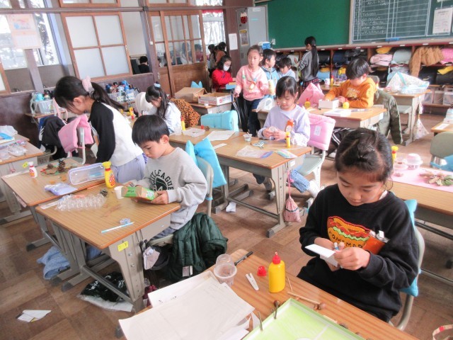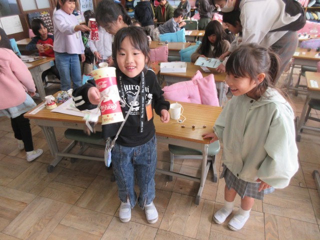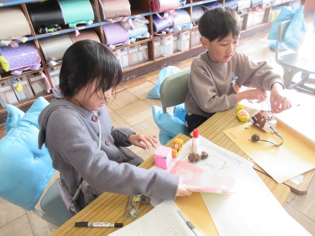 生活科「あきをたのしもう」で村木神社で集めたどんぐりやまつぼっくりでおもちゃやクリスマスリース、飾り物を作りました。それぞれに工夫をして作ったり、作ったもので遊んだりして見つけた秋で楽しみました。
