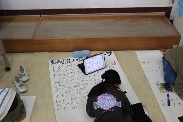 3年総合「ぶどうフェス」に向けて、一人ひとりの「伝えたい」を形にしています。10月からスタートした学習は、まず、学級の中でこれまでの学びをどのように発信していくかを考え、次に、伝えたいことを分担しタブレット端末に文章でまとめていきました。個人で行うかグループで行うかも自分たちで考えます。インタビューだけでは足りない部分は、本やインターネット、友達や先生と相談しながらみんな一生懸命に取り組んでいます。今日は、出来上がったものを模造紙にまとめる作業したり、出来上がった子たちは、学びを歌やダンス、マスコットを制作へを学びを進めたりしています。