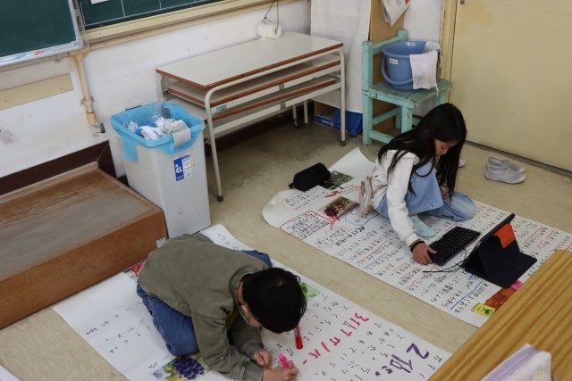 書写作品コンクールに取り組みます。「小川」、始筆、止め、はね、払い、一画一画真剣に書いていました。