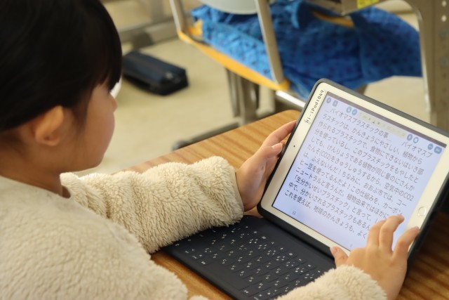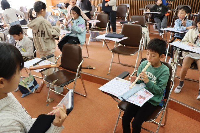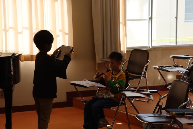 リコーダーのテストを行っていました。伴奏に合わせてリコーダーを奏でている様子をタブレット端末で録画していました。