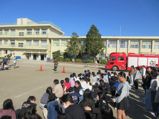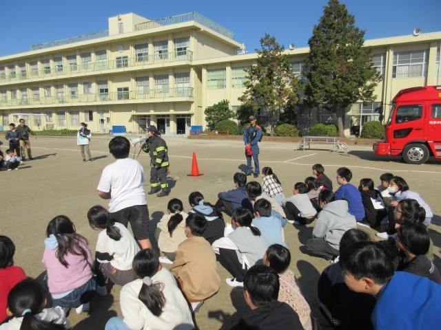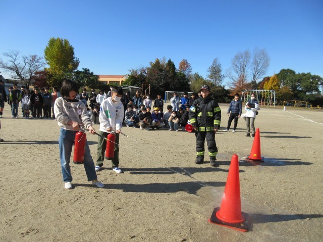 火災避難訓練 高学年は代表児童が消火器体験を行いました。消防士さんに消火器の使い方の説明をしてもらいました。