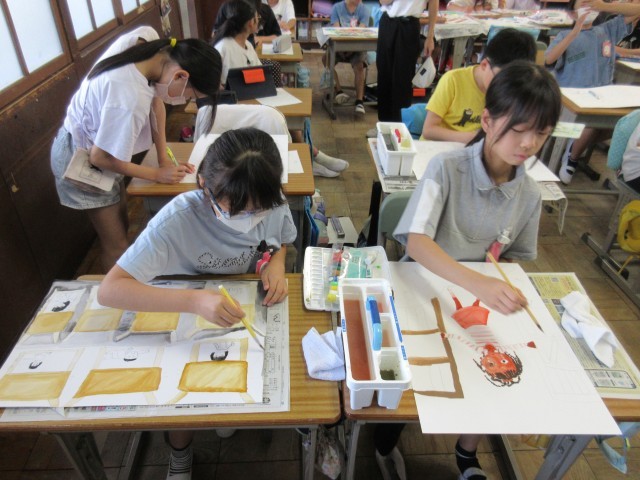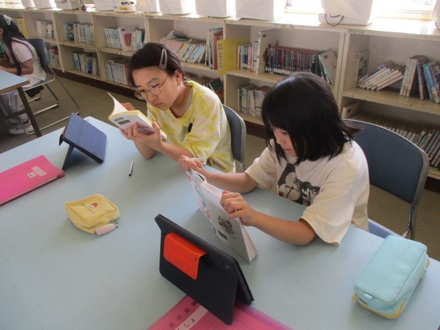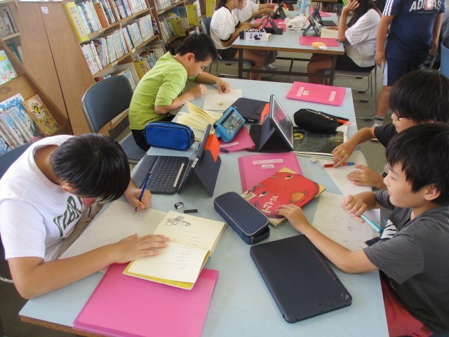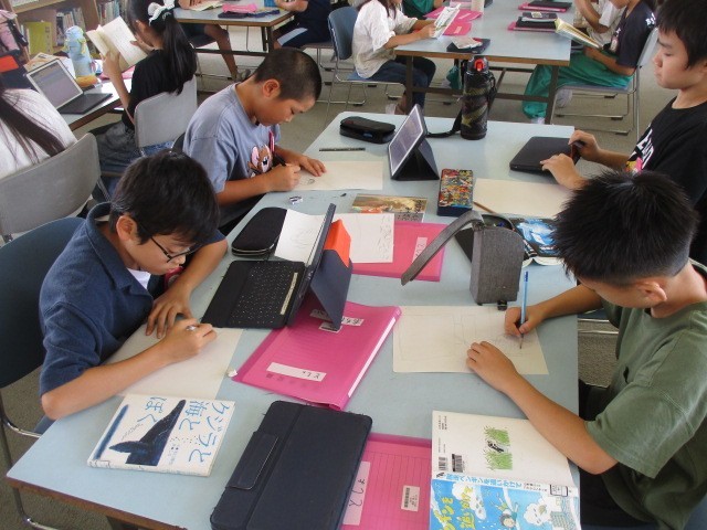 図工 読書感想画 しっかり本を読み込んでいます。どんな画面にしたら自分の思いや感動を表せるか、下書きをしています。