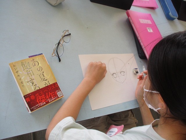 図工 読書感想画 まず本をしっかり読み込んでいます。頭に浮かんで印象やイメージを簡単な絵やメモをしてる子もいました。
