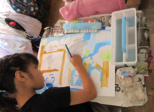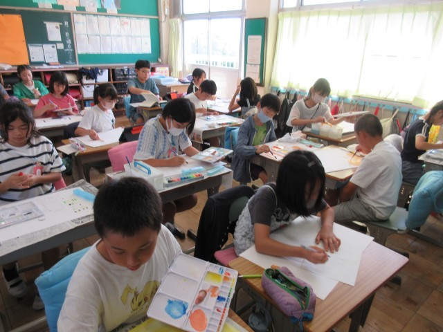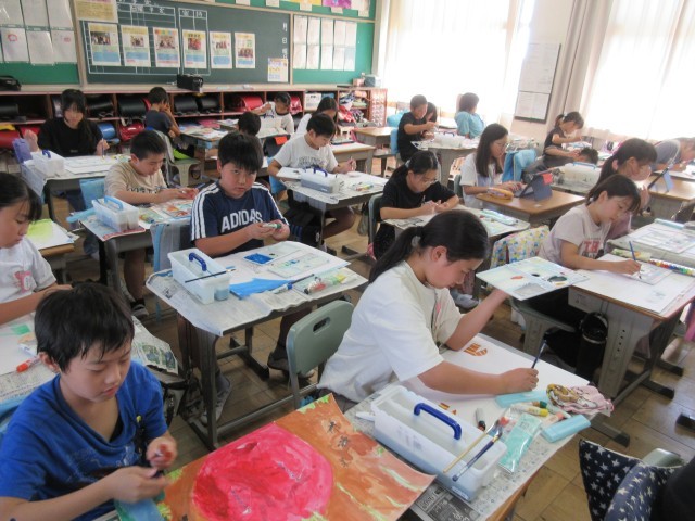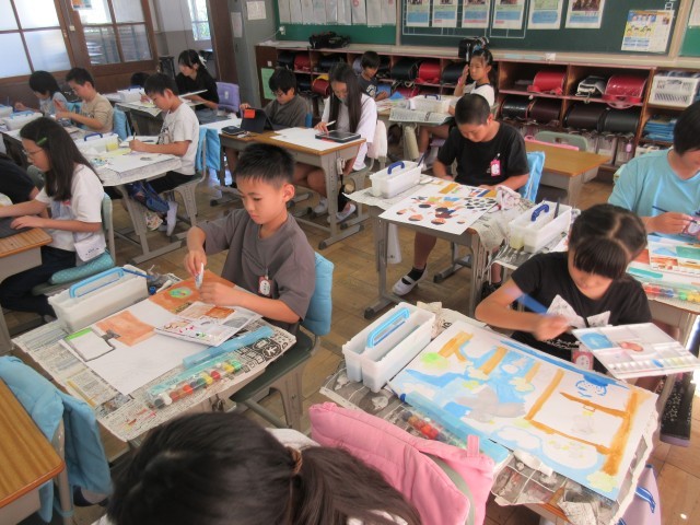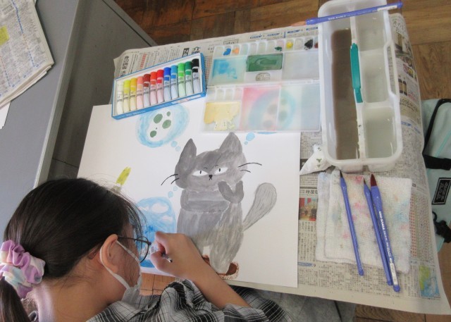 図工 読書感想画 自分の想像力をいかして色を塗り始めました。
