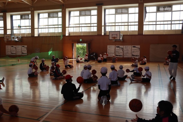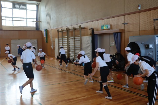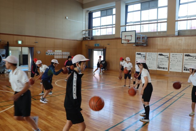 バスケットボールに取り組んでいます。ドリブルやハンドリングの練習をしていました。