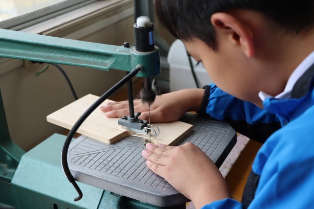 テープカッターの組み立てに入っています。糸鋸を使い形を整え組み立てていきます。