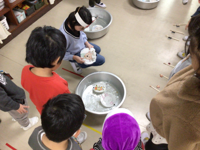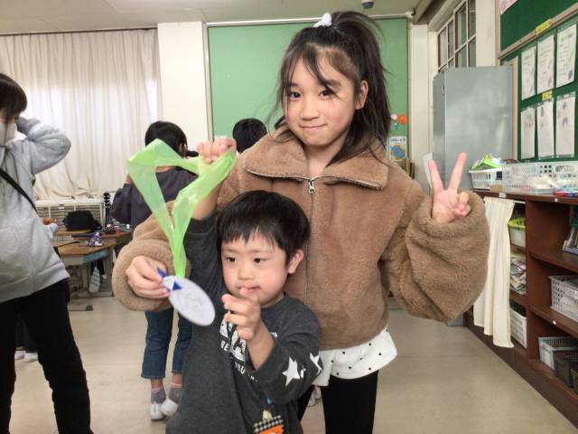 探検からもどってからは、緒川小学校司会による「猛獣狩りに行こうよ」と森岡小学校司会の、紙コップ工作(「とべ!とべ!紙コップ」)を楽しみました。