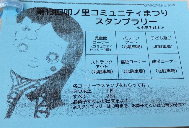 卯ノ里コミュニティセンターで行われました。ボランティアとして参加しているうのさとっ子、スタンプラリーに参加しているうのさとっ子、地域の行事で楽しい時間を過ごしていました。
