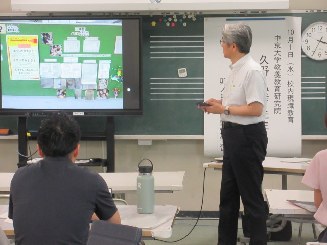 10月1日(木)現職教育研究 公開日 2025/10/01 更新日 2025/10/01 うのさとニュース 先生たちの学習会です。中京大学の先生に午後の授業を参観していただいた後、講義をしていただきました。卯ノ里小学校の個別学習や次期学習指導要領について、学びました。