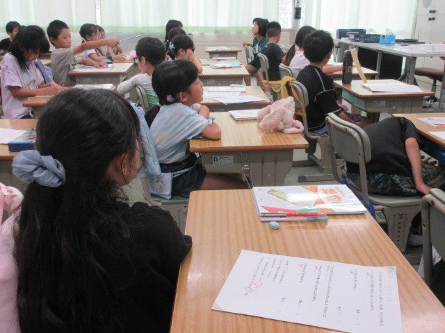 10月7日(火)2年生:算数 公開日 2025/10/07 更新日 2025/10/07 うのさとニュース プリントの問題の確認。文章問題の答え合わせ・・・文章の意味から、たし算の式になるように考えることがポイントでした。