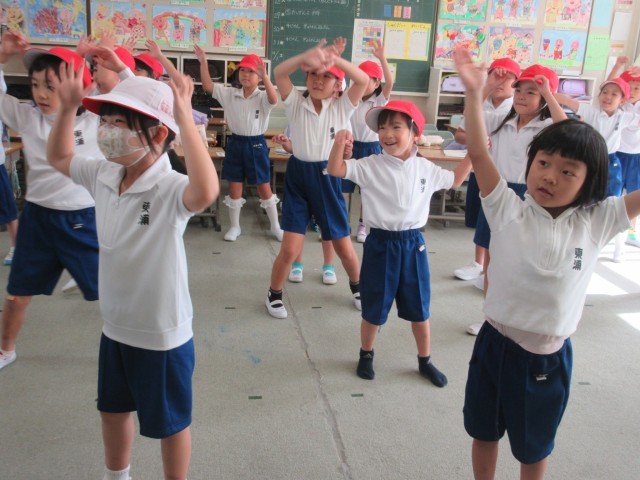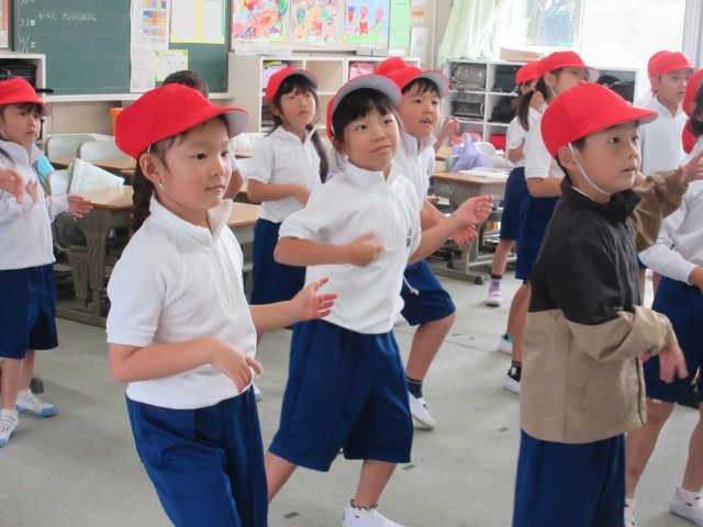 今日から、体育館は使えません。教室でダンスをしました。映像を見ながら、音楽に合わせて・・・楽しくノリノリです。