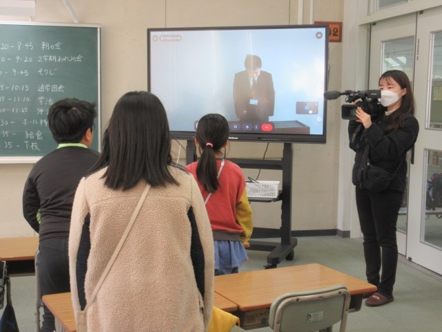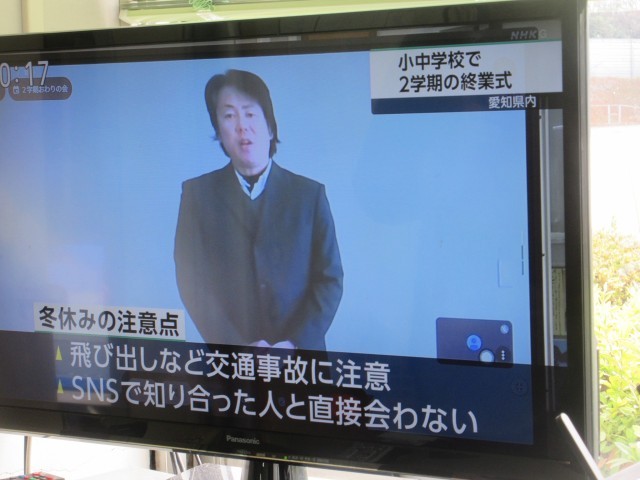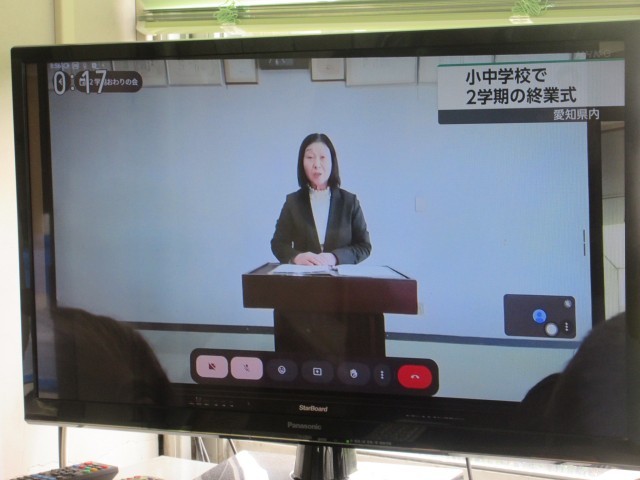 体育館が工事中のため、オンラインで2学期おわりの会をしました。今日で、2学期はおしまい!楽しい冬休みにしてくださいね。おわりの会の後、いろいろな表彰も行いました。NHKの取材が入り、テレビで放送されました。ホームページで、NHK名古屋放送局の「東海のニュース」から見ることもできます。