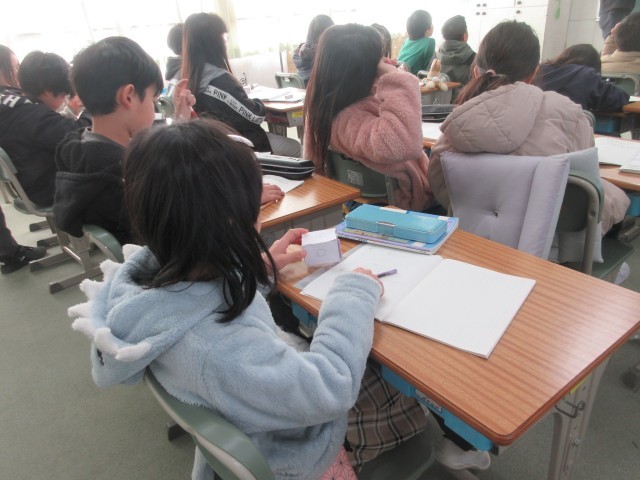 立方体や直方体の学習・・・自分で組み立てた立体を使って、面や辺の関係を調べます。平行や垂直の関係を、自分の手と頭で感じ取ることができます。