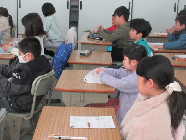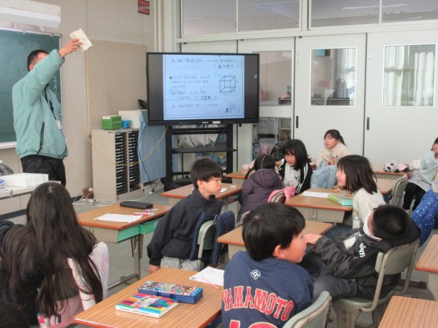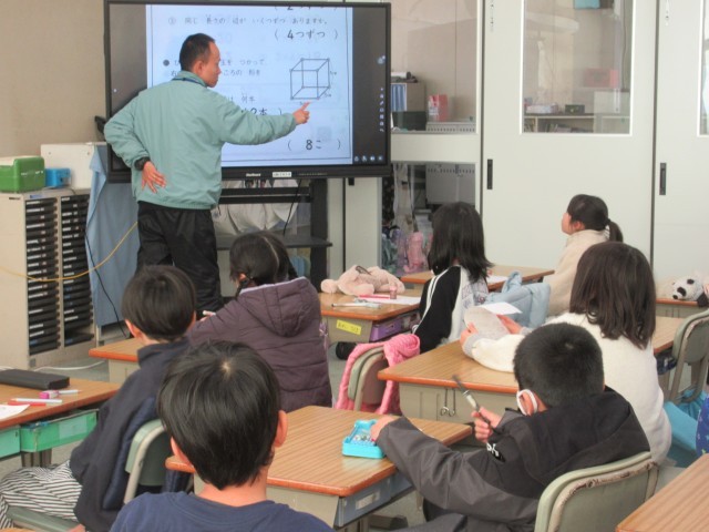 3月5日(木)2年生:算数 公開日 2026/03/05 更新日 2026/03/05 うのさとニュース 「はこの形」の練習問題の答え合わせ、そして確認をしていました。面、辺、ちょう点・・・担任の先生からの説明を聞いて、大切な言葉についても確かめました。、