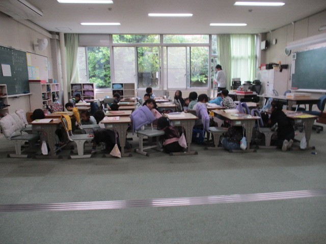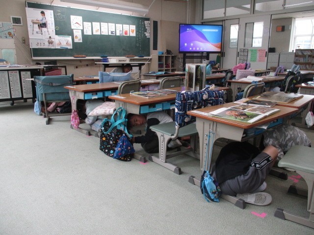 4月24日(金) ぴたっとタイム 公開日 2026/04/24 更新日 2026/04/24 うのさとニュース 朝の時間には、地震の際に姿勢を低くし、頭を守る「ぴたっとタイム」を行いました。写真は、2年生と1年生の様子です。