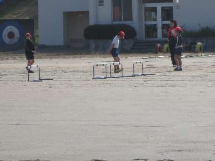 4時間目に,運動場の状態のよいところで4年生がハードル走の練習をしていました。