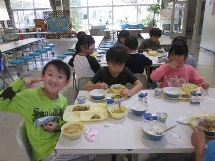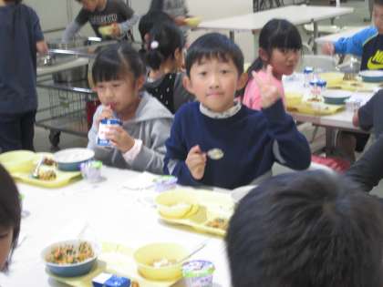 11月7日(水) 5 3年2組給食 公開日 2018/11/07 更新日 2018/11/07 うのさとニュース 3年2組は,これから老人介護施設相生の訪問学習をするので,いつもより早く給食を食べていました。おいしそうでした。