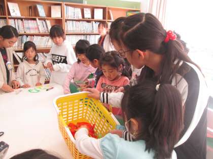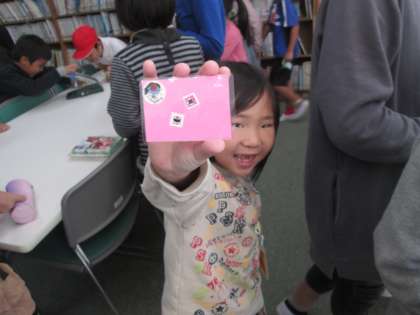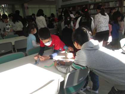 ペアで楽しくしおりができました。高学年の子どもが低学年の子どものしおりを作ってあげている様子が見られました。