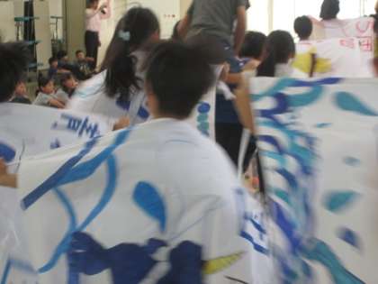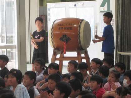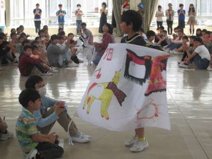 業間活動の時間に団旗授与式を行いました。1年間使う団旗を5年生が創ってくれました。