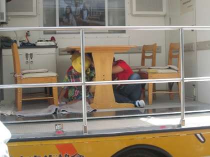 非常持ち出し品のリストアップや非常持ち出し袋の重さ体験もしました。また,震度6強の揺れを体験できる「ナマズ号」で地震体験もしました。昨年雨で体験できなかった5年生も体験しました。