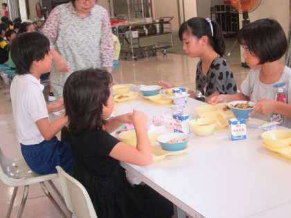 今日から1週間の間、給食はにこにこ団(縦割り班)で食べます。