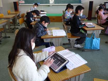 その後,リズムを意識しながら「アンダルコの歌」の鍵盤ハーモニカの指使いを練習しました。