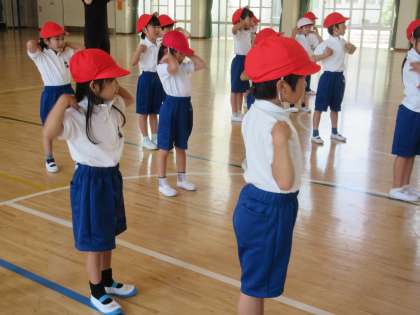 体育の授業の始めは、準備体操をします。