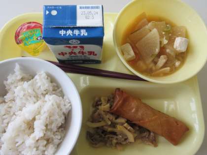 ・牛乳 ・麦ごはん ・はるまき ・チンジャオロースー ・ピリからじる ・ひとくちピーチゼリー