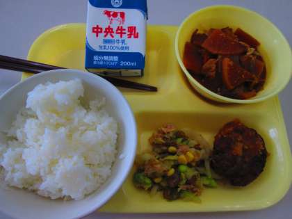 5月19日(金)給食の献立 公開日 2023/05/19 更新日 2023/05/19 うのさとニュース ・牛乳 ・ごはん ・知多牛ハンバーグおろしかぼすポンずがけ ・ふきとツナのサラダ ・あかもく入りだんごの煮味噌