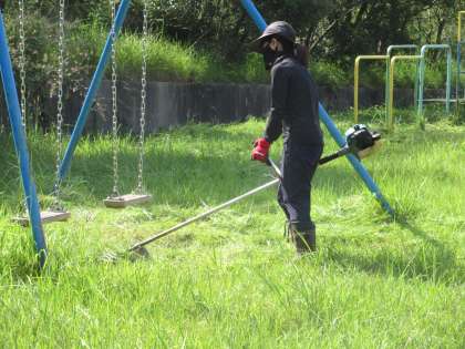 たくさん草が生えている場所を、校務主任や環境整備員の方が刈っています。