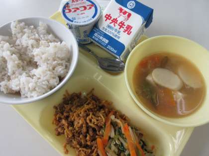・麦ごはん ・牛乳 ・ビビンバ(にく・たまご・やさい) ・トック入り中華スープ ・ヨーグルト