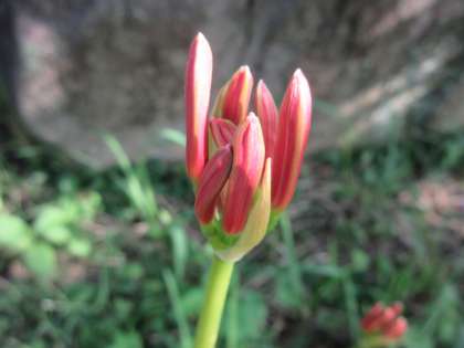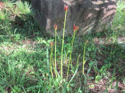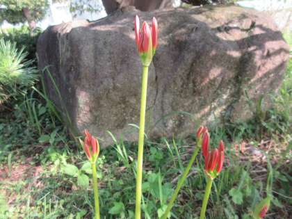 正門の近くで、彼岸花(ヒガンバナ)がくきを伸ばし、花のつぼみがふくらんでいました。