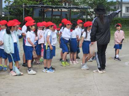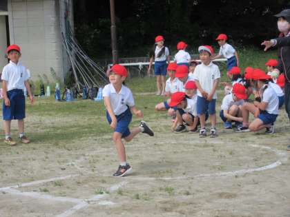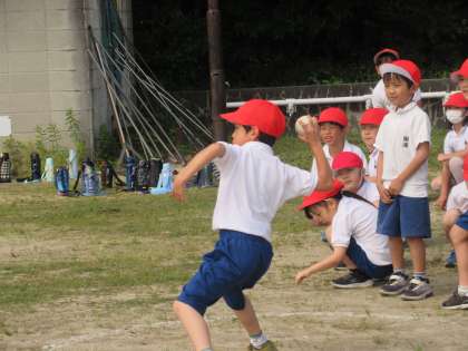 ソフトボール投げ、白い線の円をはみ出さないように投げます。