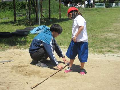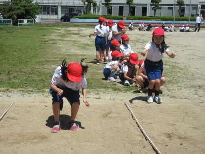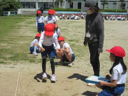 体力テストです。 立ち幅跳びは、砂場で・・・ 手を振り上げて、両足でジャンプ!