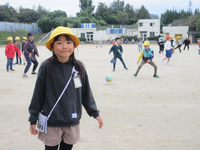 学年集会で、1組と2組が一緒に活動しました。運動場で、ドッジボールをしました。楽しそうでした。