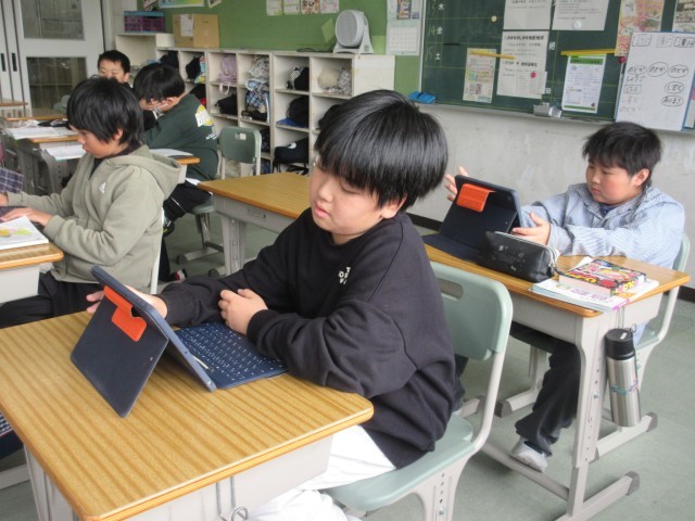 修学旅行についてまとめています。学習発表会を行う予定で、いろいろなまとめ方や発表の仕方があります。タブレットも、道具としてうまく活用しています。