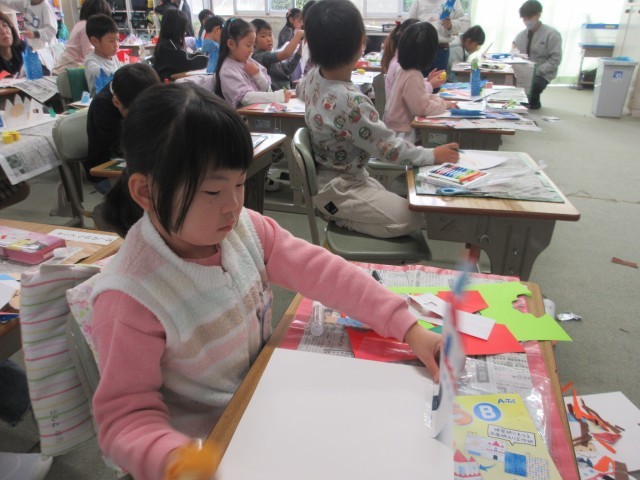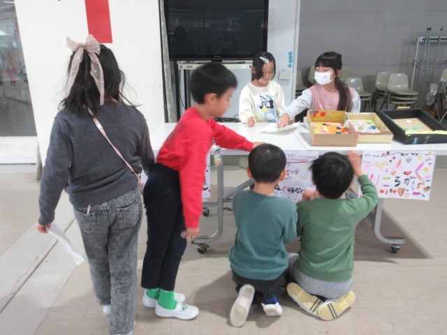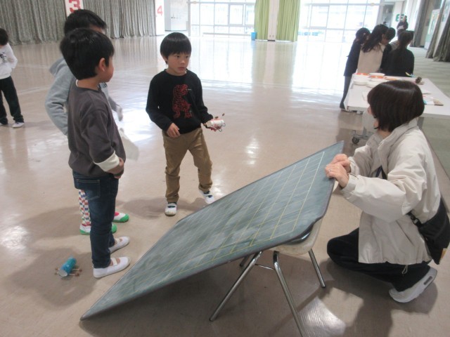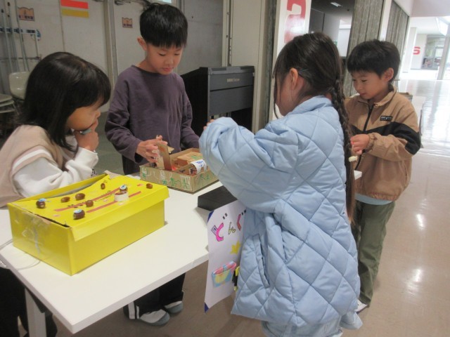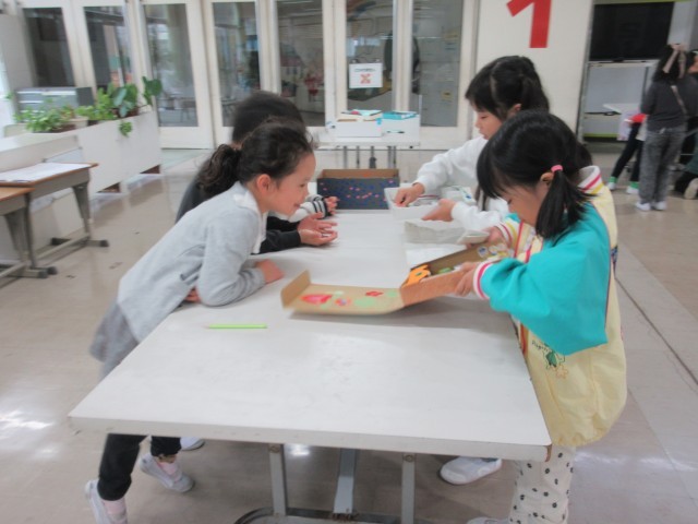 どんぐりを使ったおもちゃづくりをしています。今日は、かんばんづくりをしました。みんなで協力し合って作業をするのも楽しいですね。