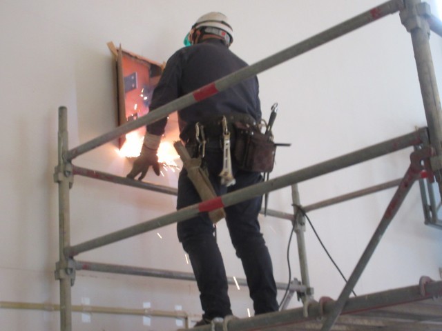 空調設備工事が行われています。今日は、鉄を削ったり溶接したりする道具を使った作業が行われていました。